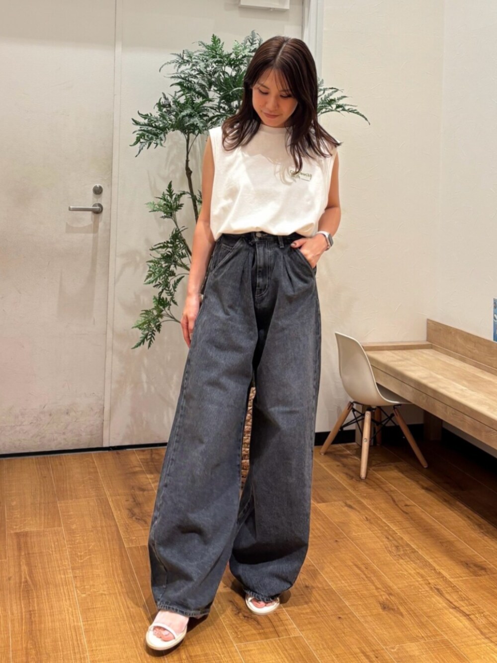 ☑︎トップス 手書き風の刺繍が可愛いタンクトップ🪡 袖部分も程よい長さなので華奢前します🫶 とっても柔らかい生地で着心地抜群◎ 楽ちんだけど1枚でお洒落見えはママとしても嬉しい♡ ☑︎デニム ゆるずるっとしたカーブシルエットが 今季らしくお洒落見えする1枚👖♡ ウエストがダブルタックがpoint✨ 骨盤からボリュームがついているので 骨格ウェーブの私はお尻腰周りがカバーされて スッキリ綺麗に見えました!(うれしーっ!) 154cmで24inch着用 ぺたんこで裾が少し付くくらいです◎