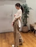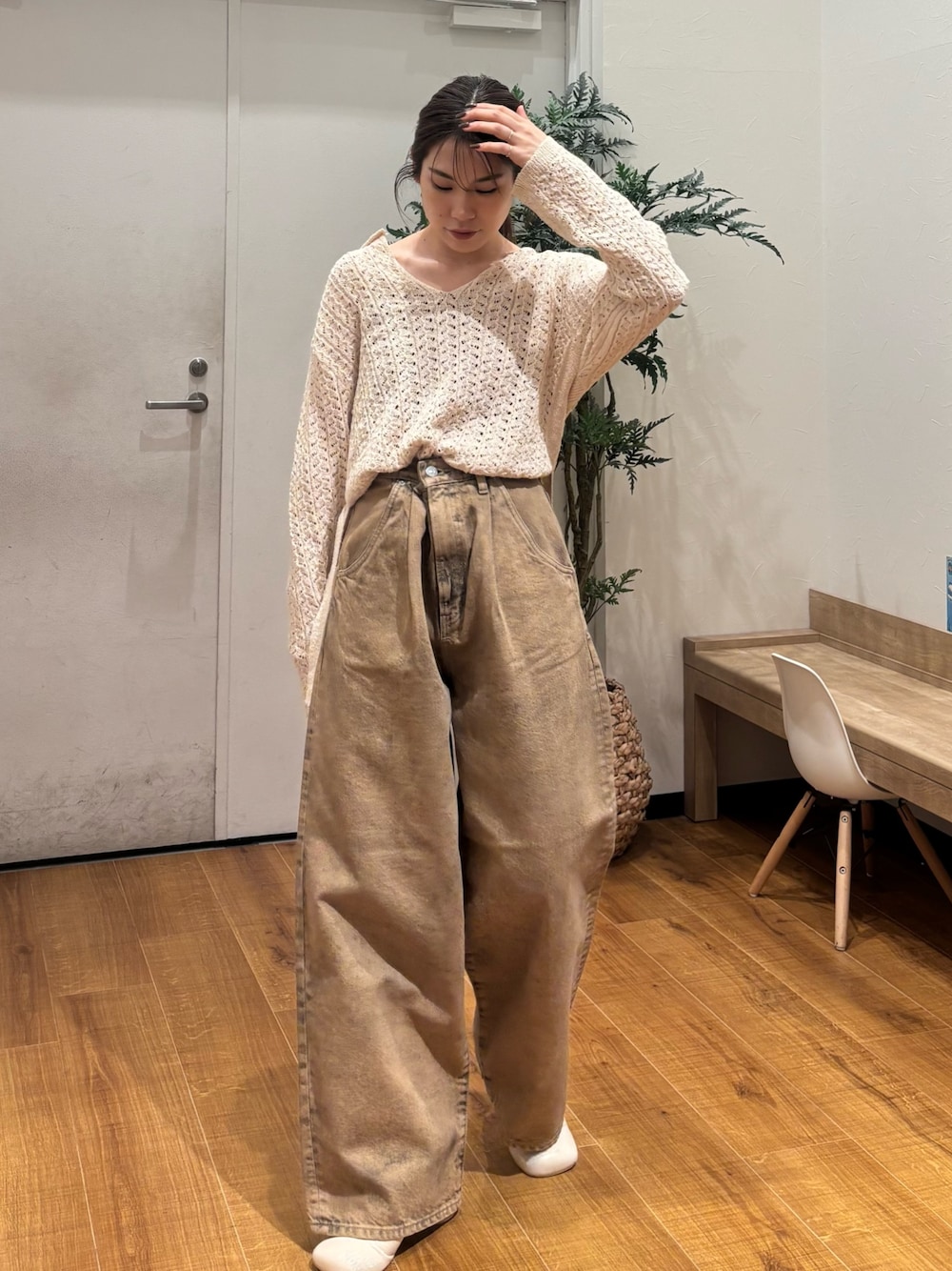 【トップス】透かし編みデザインが可愛いニットです🧶お尻がすっぽり隠れる丈感で、サイドスリットがあるのでインでもアウトでもすっきり着回しやすい1枚です◎ 【ボトムス】ブリーチで色を抜いた後にさらに色を入れヴィンテージ感を出したお洒落デニム👖🤎ウエスト部分に入ったタックも立体感が出てシルエットが可愛いです♡ 154cm/24inch着用で7センチヒール履いております!