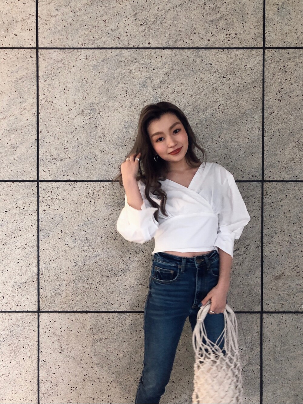 ボリュームスリーブが可愛いショート丈のブラウス。スキニーと合わせてすっきり女性らしいコーデにしました。小物もホワイトで合わせて春らしい印象に。