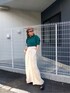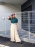 馴染みの良いグリーンを取り入れた大人カジュアルスタイル♪【tops】シンプルでどんなアイテムにもマッチするTシャツ。カーブのかかった袖のデザインがモードな印象を与え、カジュアルになりすぎずレディライクな雰囲気で着て頂けるのでワンランク上のスタイリングに♡USAコットン(程よく厚みがあり、ざらっとした質感)を使用しており、形崩れしにくく着心地も抜群です!【pants】前から見るとラップスカートを履いているようなデザインが魅力のパンツ。大人見えするお洒落感満載のアイテムです。リネン素材を使用しており夏コーデにもぴったり◎ウエスト後ろ部分はゴム仕様でストレスフリーなのも◎合わせるトップスは体にフィットする物やINしてメリハリを作るとよりスタイルアップ見えできます♡
