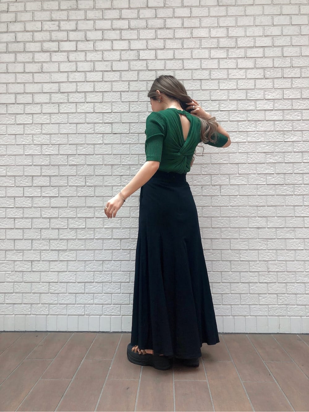 【tops】バックスタイルがPointのニットトップス♡肌見せとツイストのデザインが目を引きます。フロントはシンプルなのでどんなコーデにも合わせやすいです!ハーフスリーブなので春〜秋までロングシーズン着用できます。今回はトレンドのグリーンをチョイス。明るめのカラーなのでブラックと合わせても重たくなりません♪【skirt】夏らしいマキシスカート♡コットン素材が暑い夏も軽やかな雰囲気に。太めのベルト幅で腰周りはフィットし、裾は生地を重ねたボリューム感のあるフレアシルエットが女性らしいアイテムです♪前後の長さが違うので歩くたびに動きが出るのもPointです!【hat】トレンド感満載のシアーバケットハット♡暑い夏にぴったり!光に当たると程よい透け感がでるので重く見えず軽やかな印象になります。しっかりとハリ感のあるシアー生地なので型崩れしにくく持ち運びもしやすいです。シンプルになりがちな夏コーデのアクセントとしても日差し対策としてもおすすめです♡