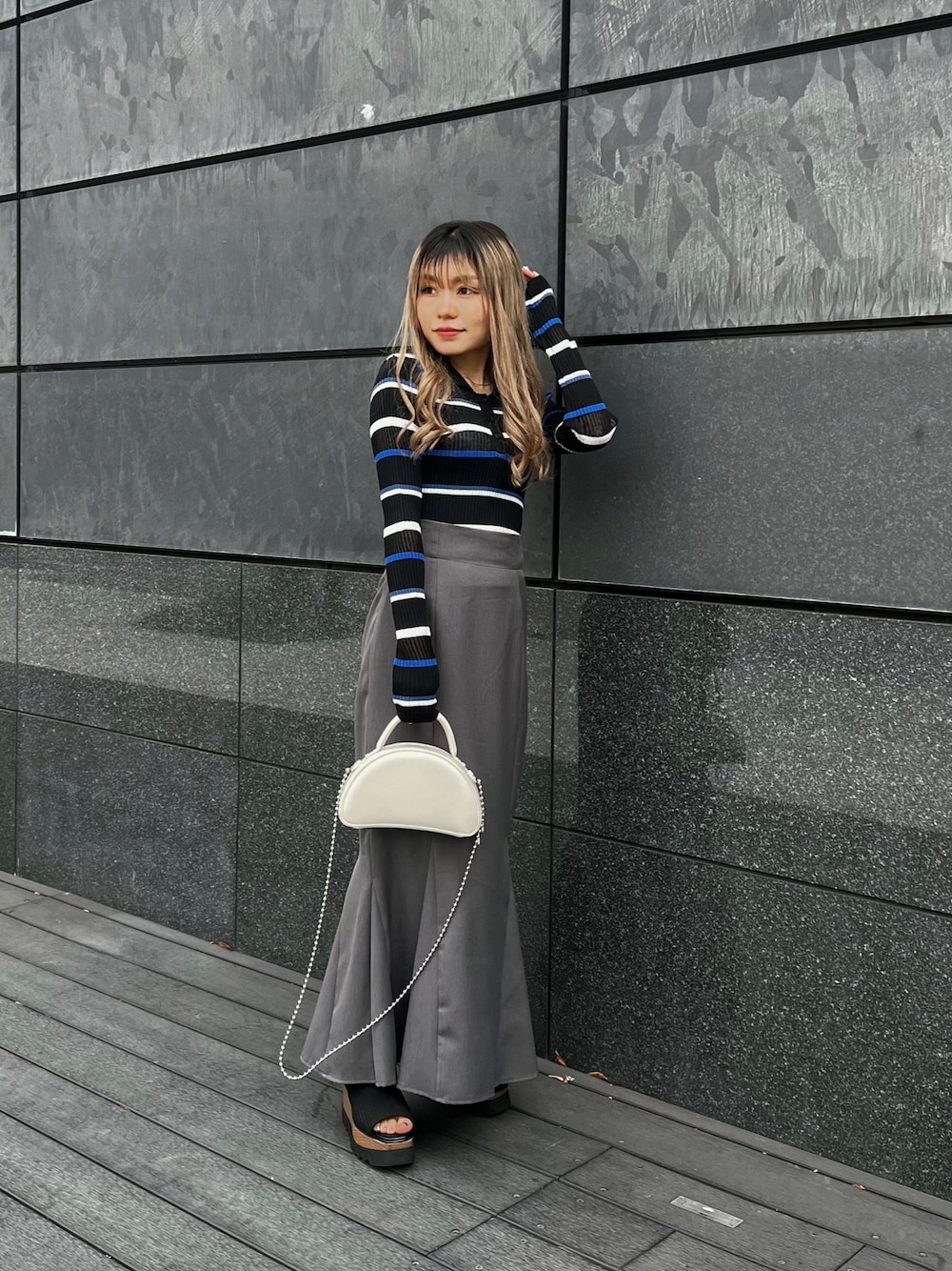 ▶︎▶︎▶︎きれいめモノトーンコーデ【tops】さりげない透け感がPointのボーダートップス!タイトなシルエットなのでボリュームのあるボトムにも◎今回着用してるブルーはインナーにもおすすめです♡【skirt】MURUA定番の美シルエットマーメイドスカート!少し光沢感のある素材が上品な印象に。ウエストベルトのデザインがスタイルアップさせてくれます。148cmでくるぶし隠れる丈感なのでヒール着用がおすすめです!【bag】限定ノベルティバッグ♡手持ちもショルダーにも使えます◎