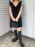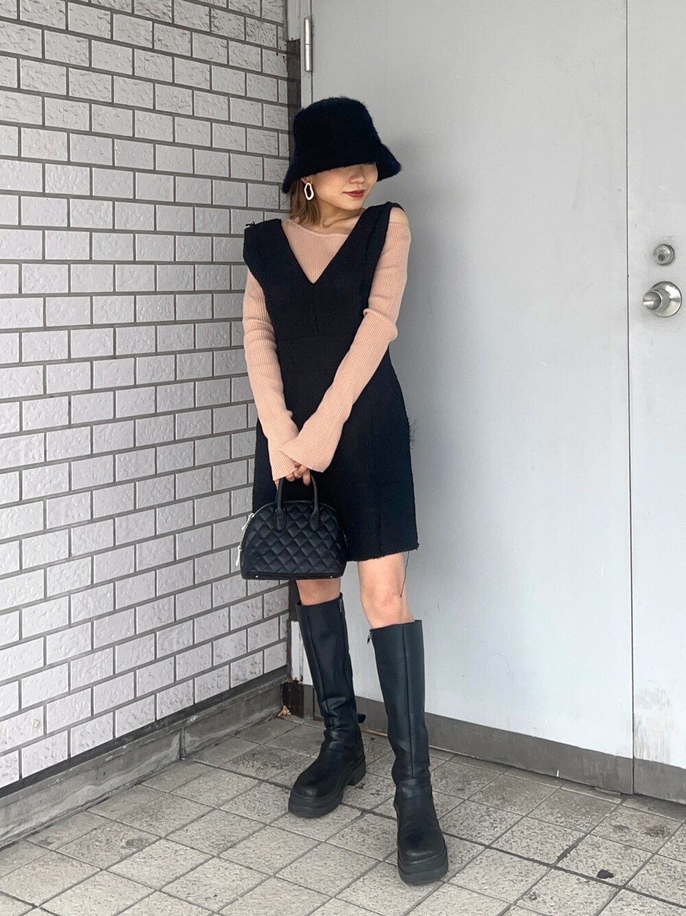 《トレンド素材でフェミニンモード♩》 【tops】ヘルシーな肌見せが楽しめるタイトニット。鎖骨が綺麗に出るデザインで華奢見え効果も◎豊富なカラバリも魅力! 【one-piece】トレンドのツイード素材が可愛いジャンスカ♡裾と切り替え部分はフリンジ加工です。広めの前後Vネックでスッキリ細見え!148cmで膝上10cmぐらいの丈感です。 【shoes】軽くて歩きやすさ抜群のおすすめロングブーツ!フラットソールなので疲れ知らず、長時間の着用も◎