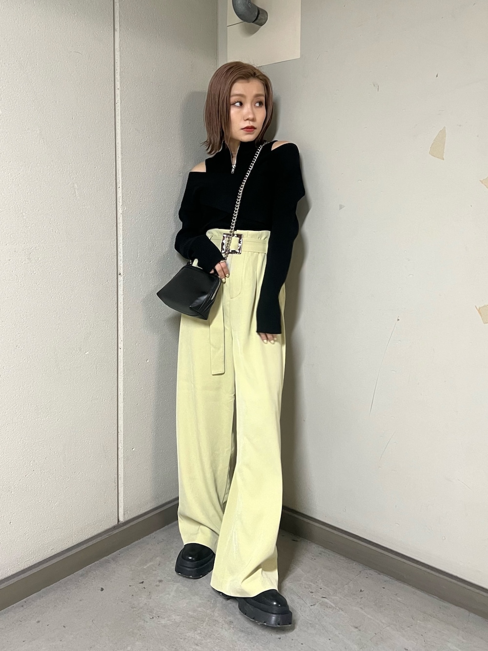 カジュアルな肌見せコーデ 【tops】ヘルシーな肌見せが楽しめるデザインニット。カシュクールと肩出しで女性らしさもありつつ、ZIPでカジュアルダウン◎柔らかい生地感で着心地も良いです! 【pants】毎年人気のワイドパンツが春らしいカラーで今季も登場♡タック入りでウエスト周りをスッキリ見せてくれます。148cmでも少し厚底のシューズで綺麗に履けます! 【shoes】カジュアル派さん必見!インソールでさりげなくスタイルUP♡キレイめコーデのハズしアイテムとしても◎