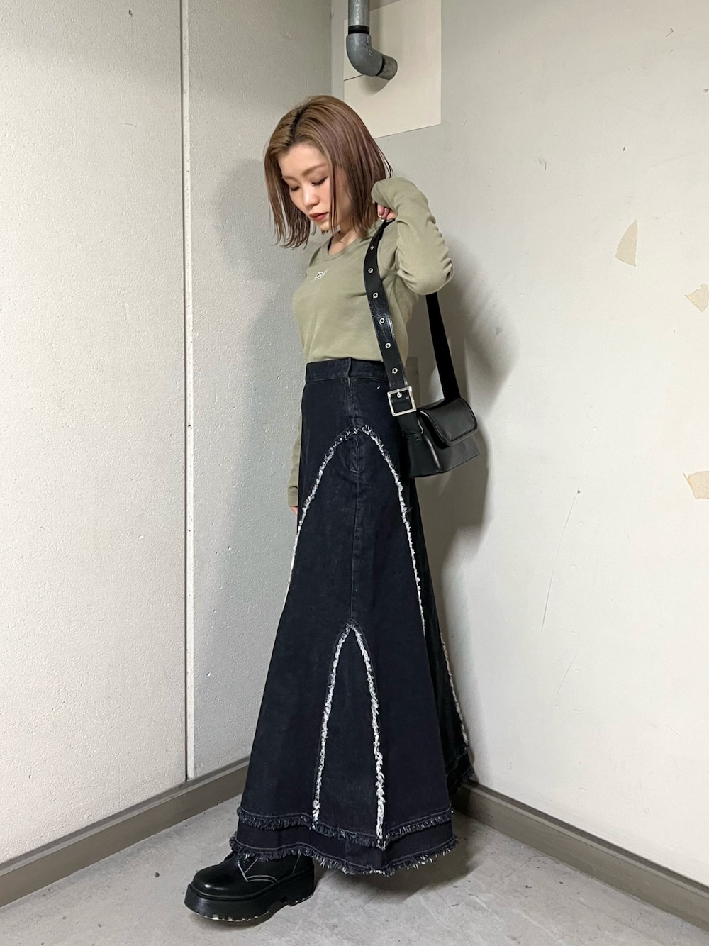 春定番item♩ 【tops】mumuロゴ入りロンT♡ロゴ部分のさりげない肌見せがPoint◎シンプルなデザインと程よくフィットする素材感が普段使いにおすすめです。 【skirt】MURUAらしいこだわりデザインのデニムスカート!カジュアルな素材でもマーメイドシルエットなので女性らしい雰囲気に♡148cmだとくるぶし丈です! 【shoes】シーズンレスで使えるブーツ♡インヒール入りでナチュラルにスタイルアップできます!