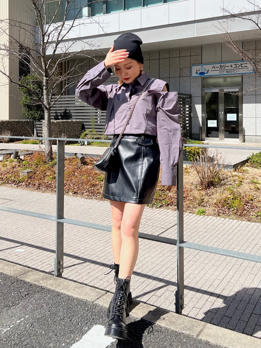 レイヤード風シャツコーデ 【shirt】2way仕様の万能シャツ。裾を折り返すとクロップドシャツに!肩の肌見せもできる春におすすめのアイテムです◎ 【skirt】フェイクレザー素材のミニスカートはどんなitemとも合わせやすく1着持ってると重宝します!148cmで膝上10cmぐらいです。 【shoes】シーズンレスで使えるブーツ♡インヒール入りでナチュラルにスタイルアップできます!