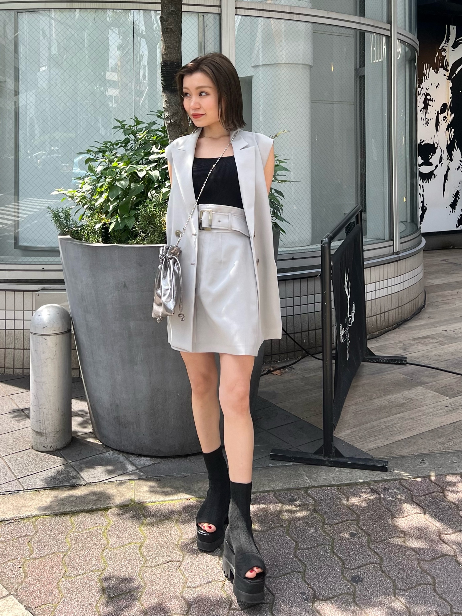 《大人気のジレセットアップが今年も登場♡》 【tops】着回しやすいベーシックタンク。カラバリ豊富で何色も欲しくなります♡ドライタッチ素材なので真夏にも◎ 【jacket】今年も大人気のジレSETUP!!広すぎない肩幅と裾に向かって広がるAラインのシルエットが細見えします◎148cmだとお尻まですっぽり隠れる丈感です。 【skirt】ジレと同素材のミニスカート!ボディラインを拾いすぎず単品使いも◎同素材のパンツもありますが低身長さんはミニスカとのSET着用がおすすめです♩ 【shoes】大人気のソックスブーツが夏仕様に。傾斜が少なく安定感のあるソールで履きやすさ抜群◎イチオシシューズです!