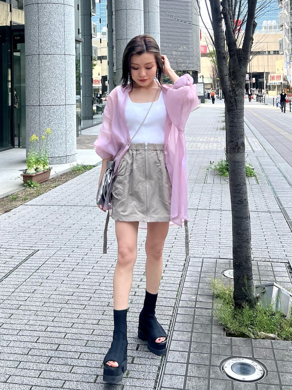 《夏定番のシアーシャツコーデ♩》 【shirt】毎年大人気のシアーシャツ♡お洒落にはもちろん、日焼け防止や気温調節にもおすすめの夏のマストバイitemです。 【tops】着回しやすいベーシックタンク。カラバリ豊富で何色も欲しくなります♡ドライタッチ素材なので真夏にも◎ 【skirt】トレンドのカーゴがミニスカに!カジュアルながらも女性らしく着こなせます。コンパクトなサイズ感なので低身長さんにもおすすめです! 【shoes】大人気のソックスブーツが夏仕様に。傾斜が少なく安定感のあるソールで履きやすさ抜群◎イチオシシューズです!