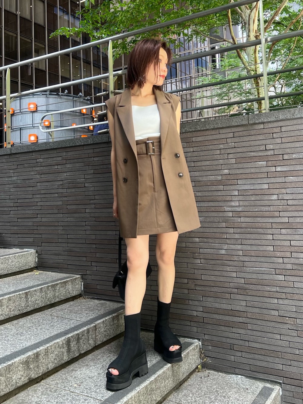 オシャレ見えSET UP♩ 【tops】色違いでほしくなるスクエアタンク。厚手の生地感がボディラインを拾い過ぎずストレスフリー◎ 【jacket】大人気のジレSETUPに新色追加!ブラウンは秋まで着回せる万能カラー♡インナー次第でロングシーズン着用できます。148cmだとお尻まですっぽり隠れる丈感です! 【skirt】ジレと同素材のミニスカート!ボディラインを拾いすぎず単品使いも◎ 【shoes】大人気のソックスブーツ!傾斜が少なく安定感のあるソールで履きやすさ抜群◎イチオシシューズです。