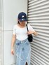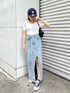 シンプルな大人カジュアルコーデ♩ 【tops】さりげないホックデザインがワンポイントに!トップスにもインナーにも使いやすいです◎ 【skirt】オールシーズン着回せるデニムスカート!大胆なスリットが女性らしいコーデに♡148cmだとくるぶし隠れる丈感です。 【cap】NEW ERAコラボキャップ♡オリジナルロゴの限定デザインです!