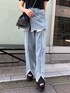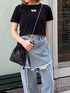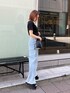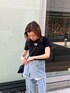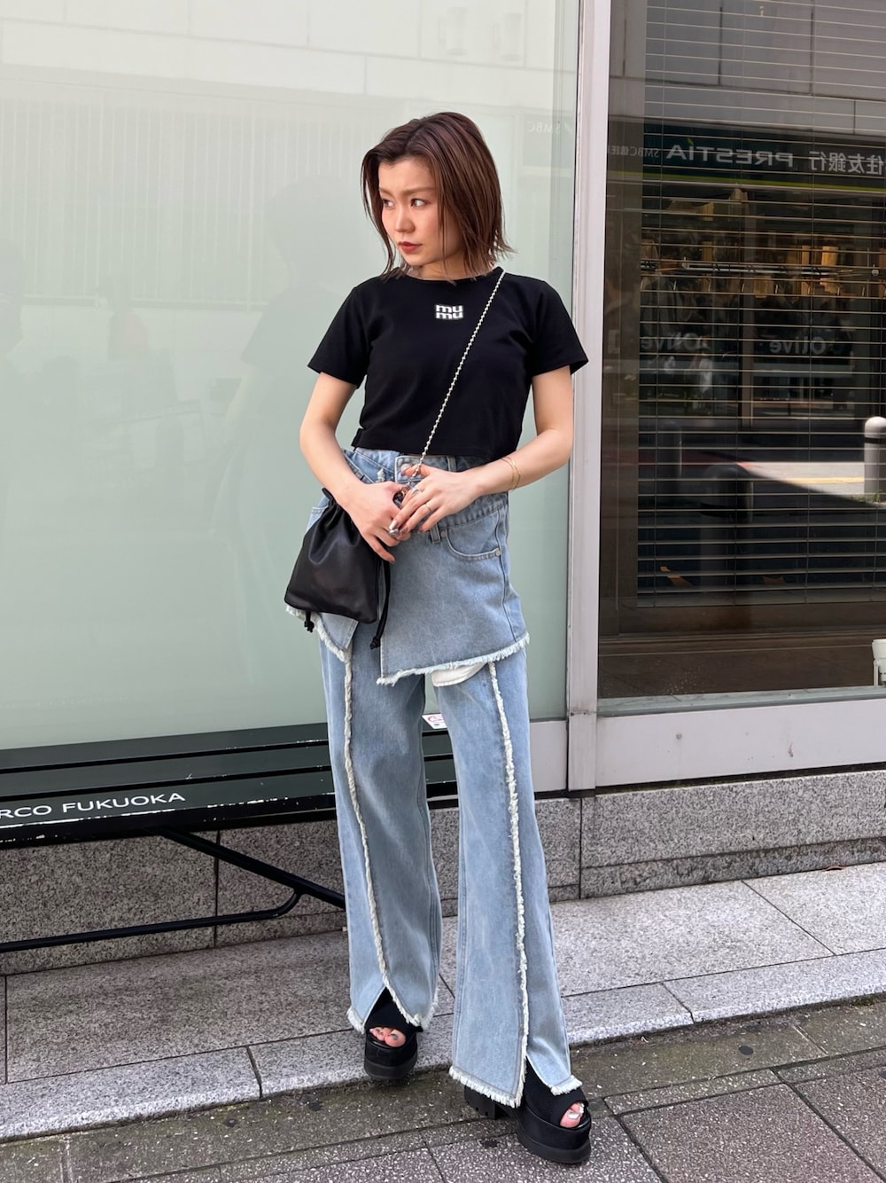 夏の定番Tシャツコーデ♩ 【tops】大人気のmumuロゴシリーズ!クロップド丈のコンパクトなサイズ感でインナーにもおすすめです♡ロゴ部分はクリアのぷにぷにした質感です。 【denim】トレンドのデザインデニム!スカートレイヤード風になっており定番のTシャツ×デニムのコーデもワンランクUP◎低身長さんは厚底シューズと合わせるのがおすすめです!