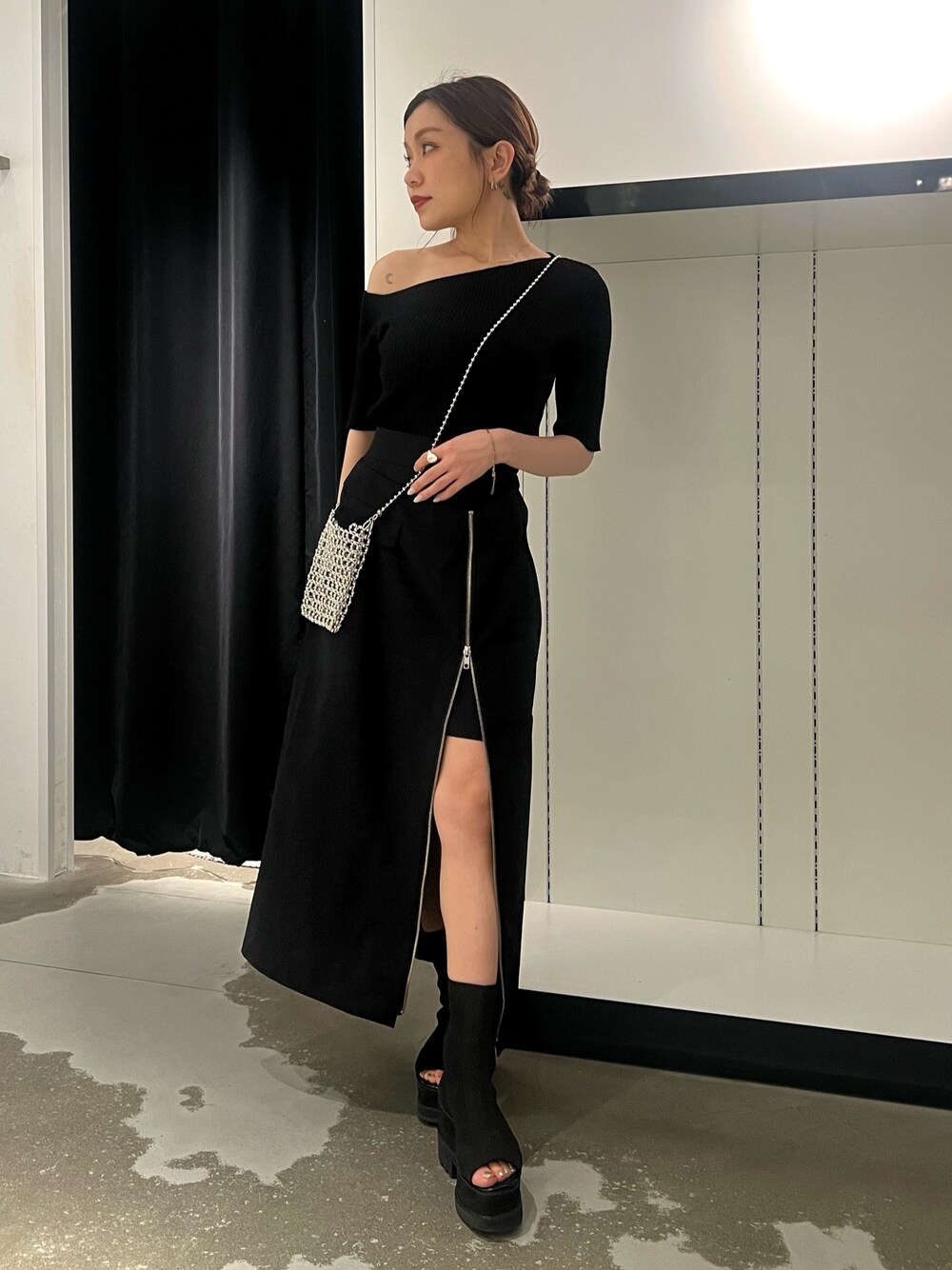 【tops】店舗限定item♡程よく肌見せできるワンショルデザイン!スタッフ人気も高いです! 【skirt】MURUAらしさ満載のデザインスカート!ZIPを閉めるとタイトスカートに、開けてスリットにするとAラインシルエットどちらも楽しめます◎148cmでもくるぶし上丈です! 【shoes】抜群の履き心地と美脚見えどちらも叶う1足!!ミニ丈ボトムと相性抜群◎普段Sサイズ着用で22.5cmでぴったりです!