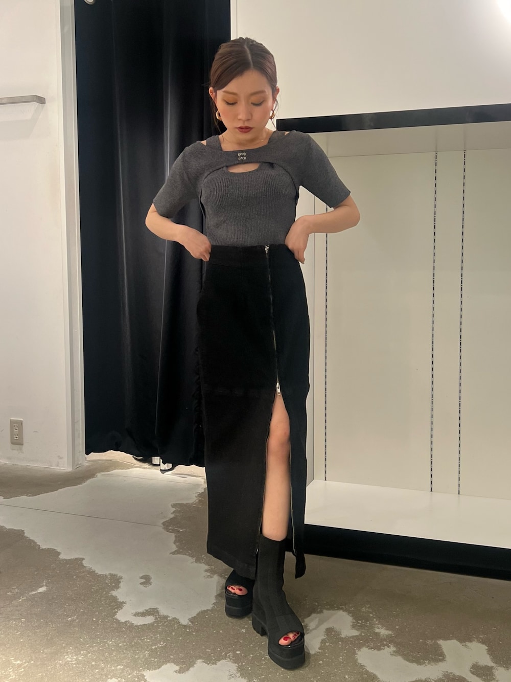 【tops】人気のトップスが半袖に♡程よい肌見せがMURUAらしく女性らしい印象に◎夏でも着やすい薄手の素材です。 【skirt】ZIPはどの位置でも着用でき、スリットの深さも自由自在!デニム素材ですが伸縮性があり履きやすいです◎148cmでくるぶし丈です! 【shoes】抜群の履き心地と美脚見えどちらも叶う1足!!どんなボトムとも相性抜群◎普段Sサイズ着用で22.5cmでぴったりです!