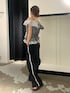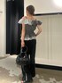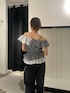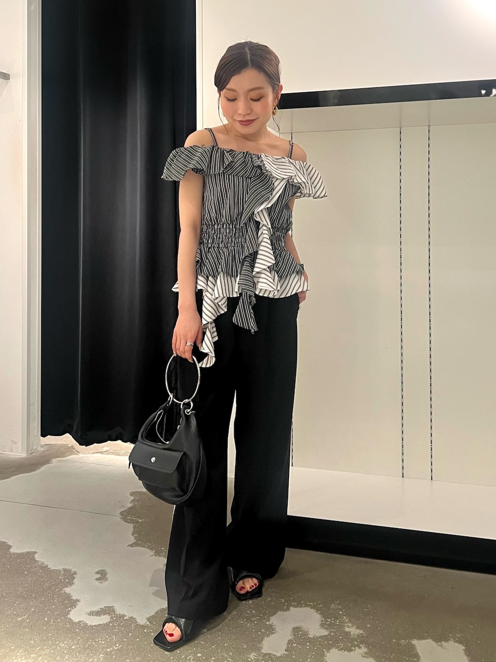 【tops】オシャレ感満載のデザインブラウス♡オフショルデザインで夏にぴったりです◎ 【pants】 落ち感のあるさらっとした素材で美脚見えが叶うストレートパンツ!ラインデザインでカジュアルにも◎148cmだとヒール着用でぴったりの丈感です。 【shoes】グリッター感が可愛いオシャレミュール!甲に当たる部分はぷっくりした柔らかい素材で痛くなりにくいです◎普段22.5着用ですが23.5で丁度いいサイズ感です!