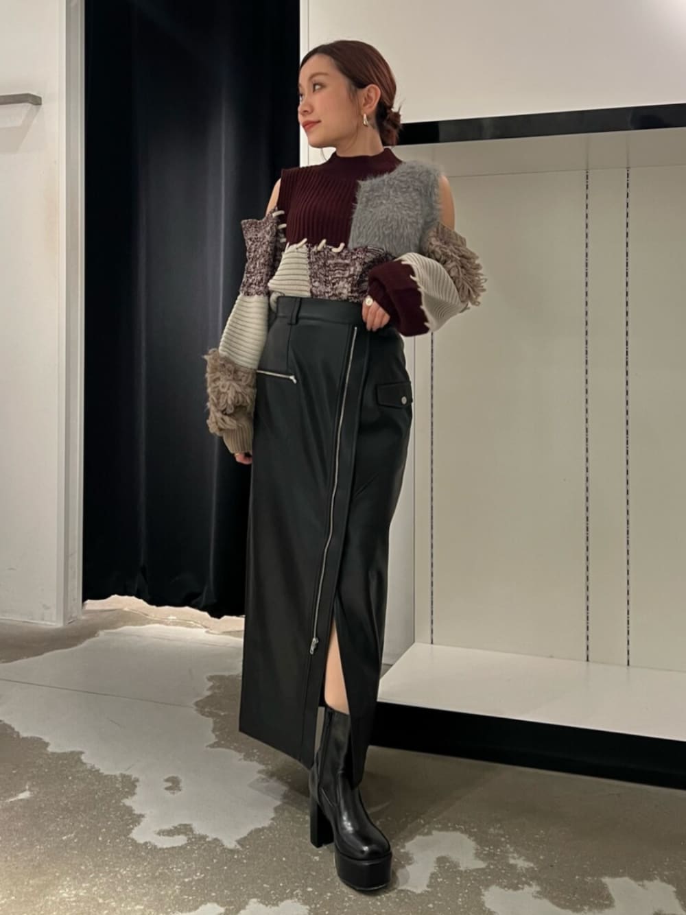 【tops】異素材デザインが他にはない主役ニット!!肩出しで抜け感もバッチリ◎ボトム次第でキレイめにもカジュアルにも着れます。 【skirt】オトナコーデにおすすめのレザースカート!伸縮性もあり着心地◎148cmだとくるぶし丈です。 【shoes】カバーが取り外し可能でショートとロング2wayで着用可能の万能ブーツ!!今回はショートverで着用。普段22.5着用でSサイズでぴったりです。