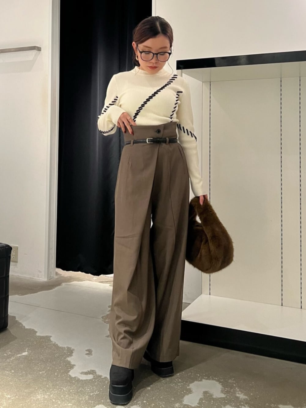 【tops】ステッチが可愛いデザインニット!1枚で着てもインナー使いにしてもワンポイントになり可愛いです◎ 【pants】美脚見えワイドパンツ!ベルト付きでウエストマークができメリハリ◎148cmだと厚底必須です! 【shoes】美脚見えブーツ!!高低差がはぼなく疲れにくく歩きやすさも◎普段Sサイズ着用で22.5cmでぴったりです。
