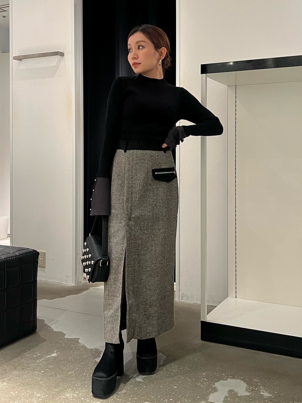 【tops】女性らしい印象のフレアスリーブニット!袖のデザインがワンポイント◎柔らかい生地感で着心地も良いです。 【skirt】冬に着たい異素材ドッキングのスカート!スリットはお好みで調整可能◎148cmだとくるぶし丈です。 【shoes】シンプルながらベロア素材でトレンド感もバッチリの美脚ブーツ!!高低差が少ないので疲れにくいです!普段Sサイズ着用で22.5cmでぴったりです。