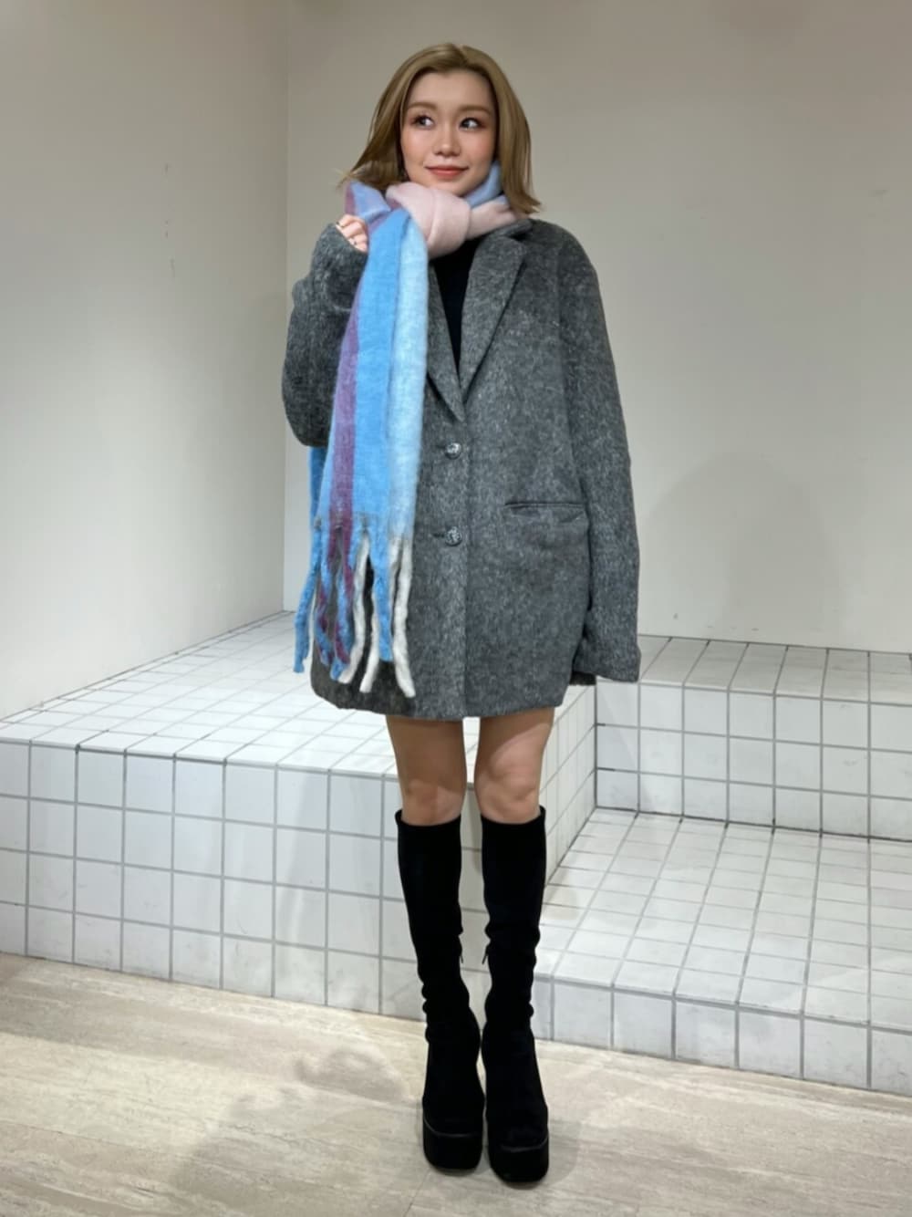 【outer】高見えシャギーコート♡ゆったりしたサイズ感なので中にも着込みやすいです! 【shoes】美脚見えロングブーツ!!さりげないヒールのリボンが可愛い🎀伸縮性もあり履き心地も抜群◎ 【muffler】バイカラーのチェック柄が可愛いマフラー🧣コーデのワンポイントにおすすめです♡