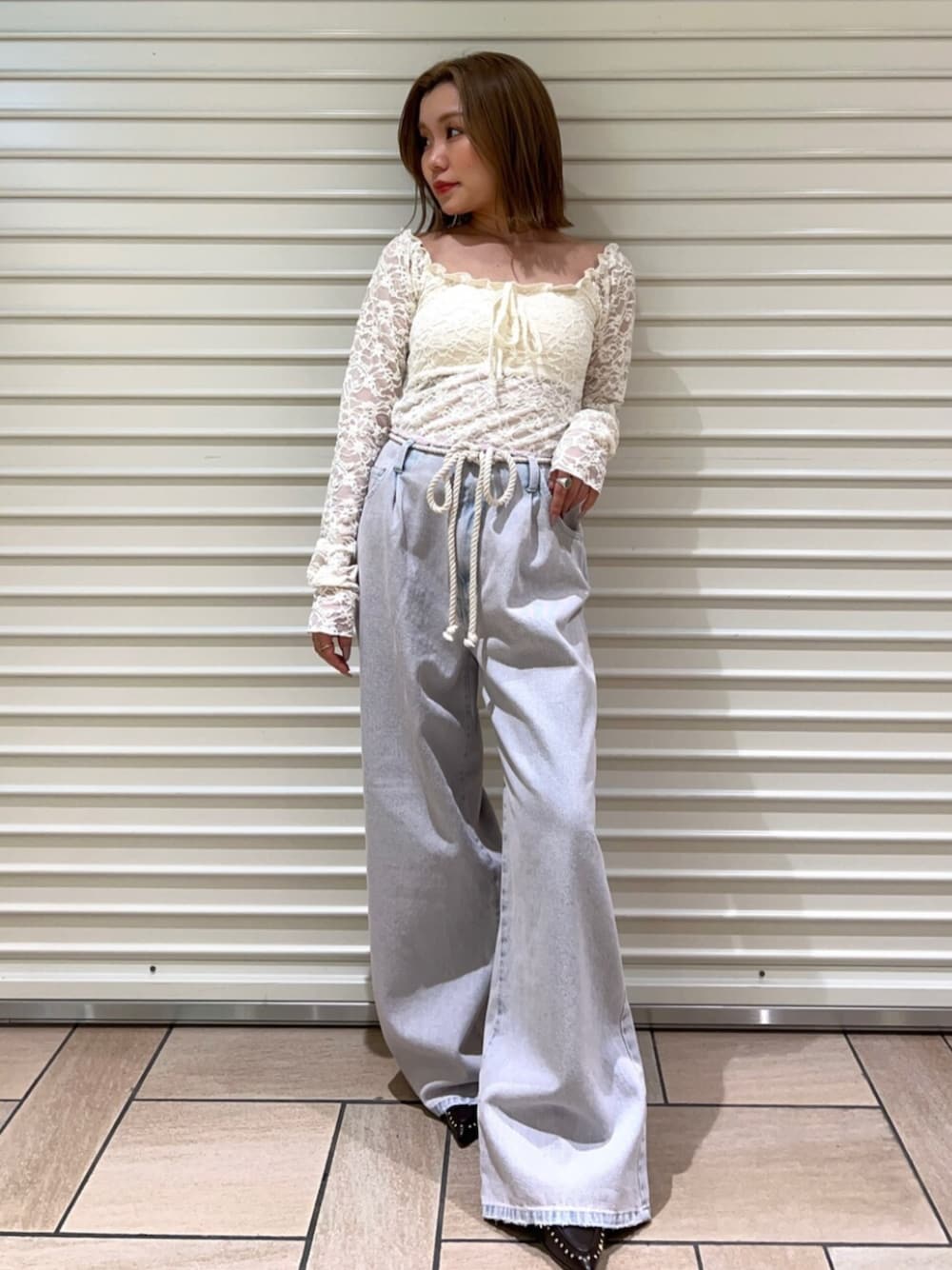 【tops】トレンドのレーストップス♡ヘルシーな背中の肌見せが可愛いです!パット付きなので1枚で安心◎ 【pants】履きやすさNo. 1デニム♡柔らかく薄手なので夏にもおすすめ!ピンクは春っぽコーデにおすすめのイチオシカラーです 🎀