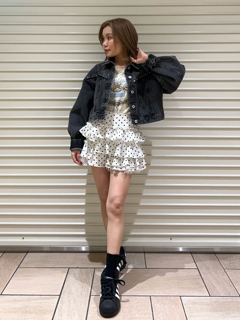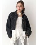 【outer】キラキラスタッズが可愛いウエスタンムード高まるデニムジャケット♡ショート丈で低身長さんもスタイルUP!! 【tops】柔らかくて着心地抜群のTシャツ!1枚で着てもインナーにしても映えるオリジナルロゴがコーデのワンポイントにおすすめ◎ 【pants】トレンドのドット柄パンツはフリルとチュールがフェミニンコーデにぴったり◎取り入れるだけでオシャレ見えします♡