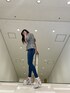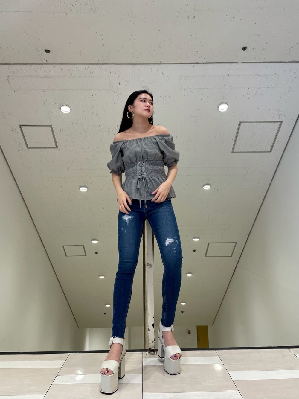 〔夏らしさUPのスキニーコーデ〕 -tops- 私は普段モノトーンが多いですが柄に挑戦してみたかったのでストライプで細見え効果もあるこちらのトップスを着用してみました★ウエスト部分が高めの作りなので細身のパンツと合わせてスタイルアップコーデに!オフショルでは無くてもご使用いただけるので着回しや雰囲気も変えて着用していただけます! -denim- ダメージ部分が膝上と太もも上部に作られているので目線が上がりトップスのアウトスタイルでも脚長効果抜群です♡生地感が柔らかめなので着脱しやすくなっております! -shoes- シューズは黒を選びがちなのであえてホワイトで合わせてみました!汚れが気になるとの声をお聞きしますが合皮で汚れのふき取りがしやすいのではじめてのホワイトシューズでもお手入れしやすいですよ♡