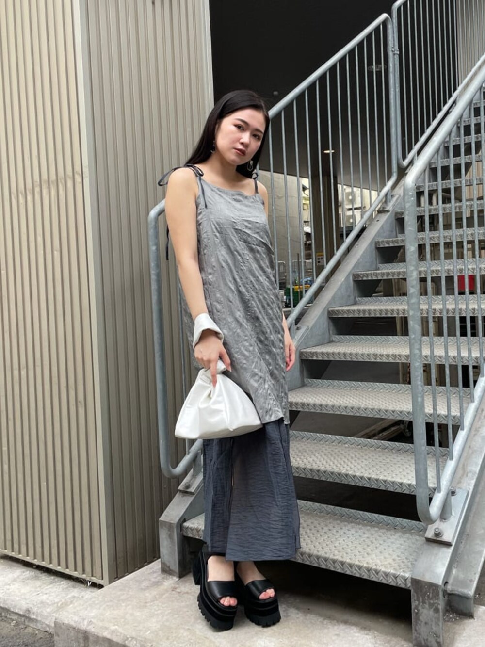 -one-piece-ショルダー部分の紐で調節可能になっているため薄めのトップスから厚めのトップスまでインナー選ばずに着用いただけます◎リバーシブルになっている為ワンピースに飽きやすい私でも着回ししやすいです★リバーシブルにするとワントーンになるのでインナーで柄物を合わせても可愛いです!髪の毛が長いので重たくならないよう1枚で着用致しました! -bag-コーデのアクセントにもなるようにホワイトのバッグを合わせました!お財布がすっぽり入るほどのサイズ感になっているので物を入れやすいです♪