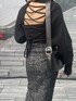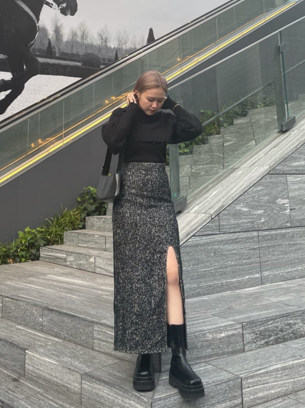 [ロングスカートのお買い物デートコーデ] -tops-クロップ丈のニットは後ろが編み編みのリボンになっている所がポイントです♡デコルテを出さない分、インナーはキャミソールを合わせて背中を見せれる組み合わせにしました!袖も160cmの私で甲の半分が隠れるほどになります! -skirt-深めのスリットが脚を細長く見せてくれるスカートは秋冬活躍する事間違いなし★スリットがある事でトップスがブラック合わせでも重たくなりません〇160cmの私でくるぶし1個分上ほどの丈の長さでした! -shoes-スカートのスリットからブーツを見せたかったので、デートでも歩きやすく脚を細長く見せてくれるサイドゴアブーツを合わせました!