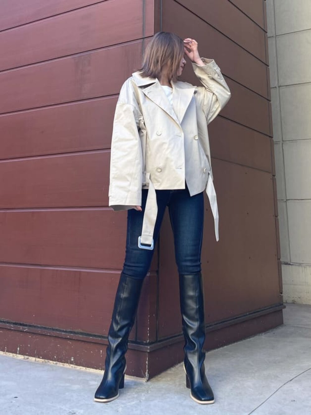 久道理沙(EMODA)のトレンチコート「ワイドショートトレンチコート」を使ったコーディネート