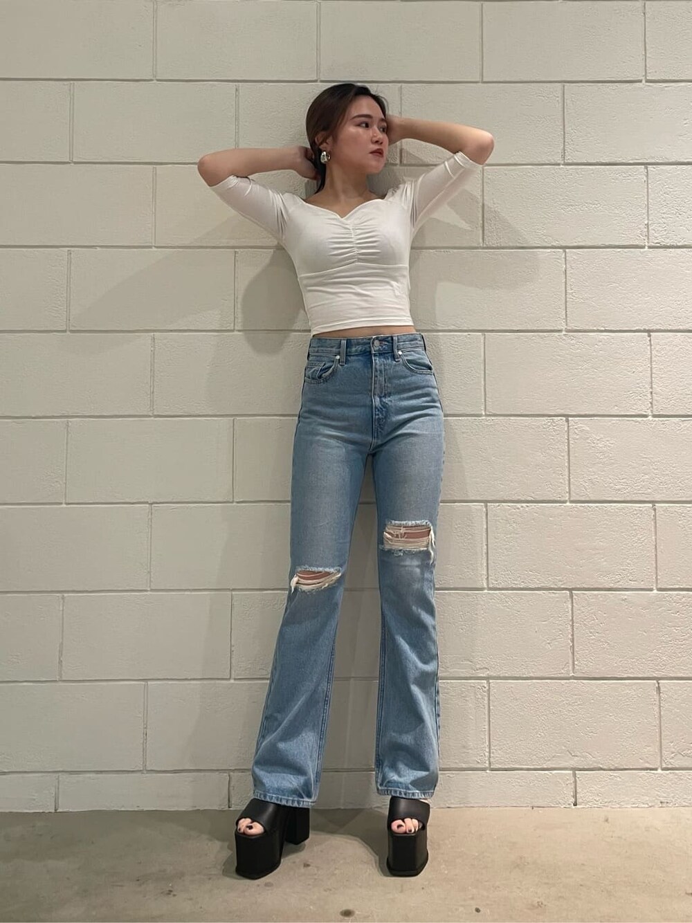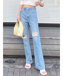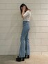 [春夏デニムコーデ] -tops-・サラッとした生地感で涼しげ・二の腕周りをカバーしてくれる・バストの切り替え位置が高めなのでスタイルアップに -denim-・160センチSサイズをスニーカーで履いて床につかない丈感・膝上のダメージなので目線が上がりスタイルアップ・細身のフレアデニム -shoes-・24センチでLサイズ・傾斜が緩いので長時間歩きやすい・甲の帯の部分が細いので足が長く見える