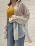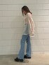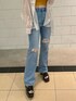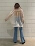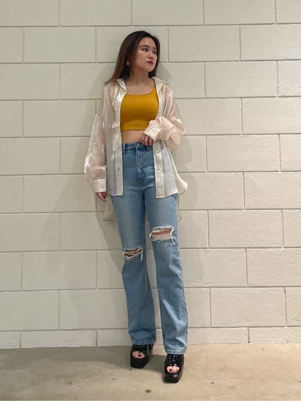 [フレアデニムの大人コーデ] -shirt-・光沢感があり1枚羽織るだけでオシャレに・160センチでお尻下の丈・シースルーなので夏の冷房対策にも◎ -denim-・160センチSサイズのスニーカーで床につかない丈・膝上のスリット位置でスタイルアップ効果に・お尻のポケット位置が高いのでヒップアップ効果 -shoes-・24センチでLサイズの着用・エナメル素材がコーデのポイントに・スクエアなので系統別で使いやすい
