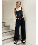 [体型カバーのサロペットコーデ] -tops-・シンプルなロゴのTシャツなのでデイリー使いできる・160センチで丈がおへそにかかる程・ピタッとしすぎないシルエット -salopette-・全体的にゆるっとしたシルエットでウエスト周りもピタッとしにくい・160センチでSサイズ着用・アジャスターで調節ができる為伸ばして古着風にも◎ -shoes-・傾斜がほぼない為長時間歩きやすい・シンプルなデザインでボトムを合わせやすい・厚底までは履けないけど少し高めで歩きやすいのを履きたい方にオススメ