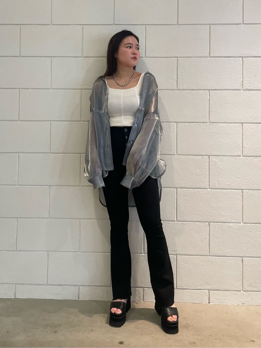 [シースルーシャツのモノトーンコーデ] -shirt-・光沢感があり1枚羽織るだけでオシャレに・160センチでお尻下の丈・シースルーなので夏の冷房対策にも◎ -tops-・柔らかい肌触りの良い素材・160センチでおへそにかかる丈感・うっすら縦に線が入っているのでボディラインが綺麗に見える -denim-・ウエストのカットデザインが腰回りを細く見せてくれる・伸縮性が高く動きやすい・裾が切りっぱなしでカジュアルなデザイン