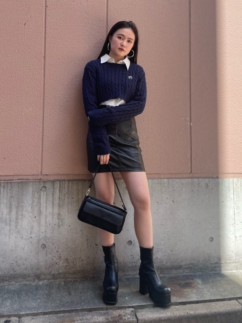 【 ミニ丈トップス×ミニ丈スカートのコーデ】 -tops-・160cmで胸下4cm程の丈感・胸元のロゴがあることで目線が上がりスタイルアップ効果に・インナー次第で雰囲気を変えられる -shirt-・おへそ上の丈感・下が切りっぱなしなのでフォーマルに見えずにカジュアル見えする・1枚での着用も可能 -skirt-・インナー付きなので安心感がある・タイトが好きな方はSサイズがオススメ・レザーで一気に秋らしく見える -shoes-・24センチでLサイズで少しゆとりがあるサイズ感・傾斜が緩く軽めなので歩きやすい・合皮で馴染みやすい