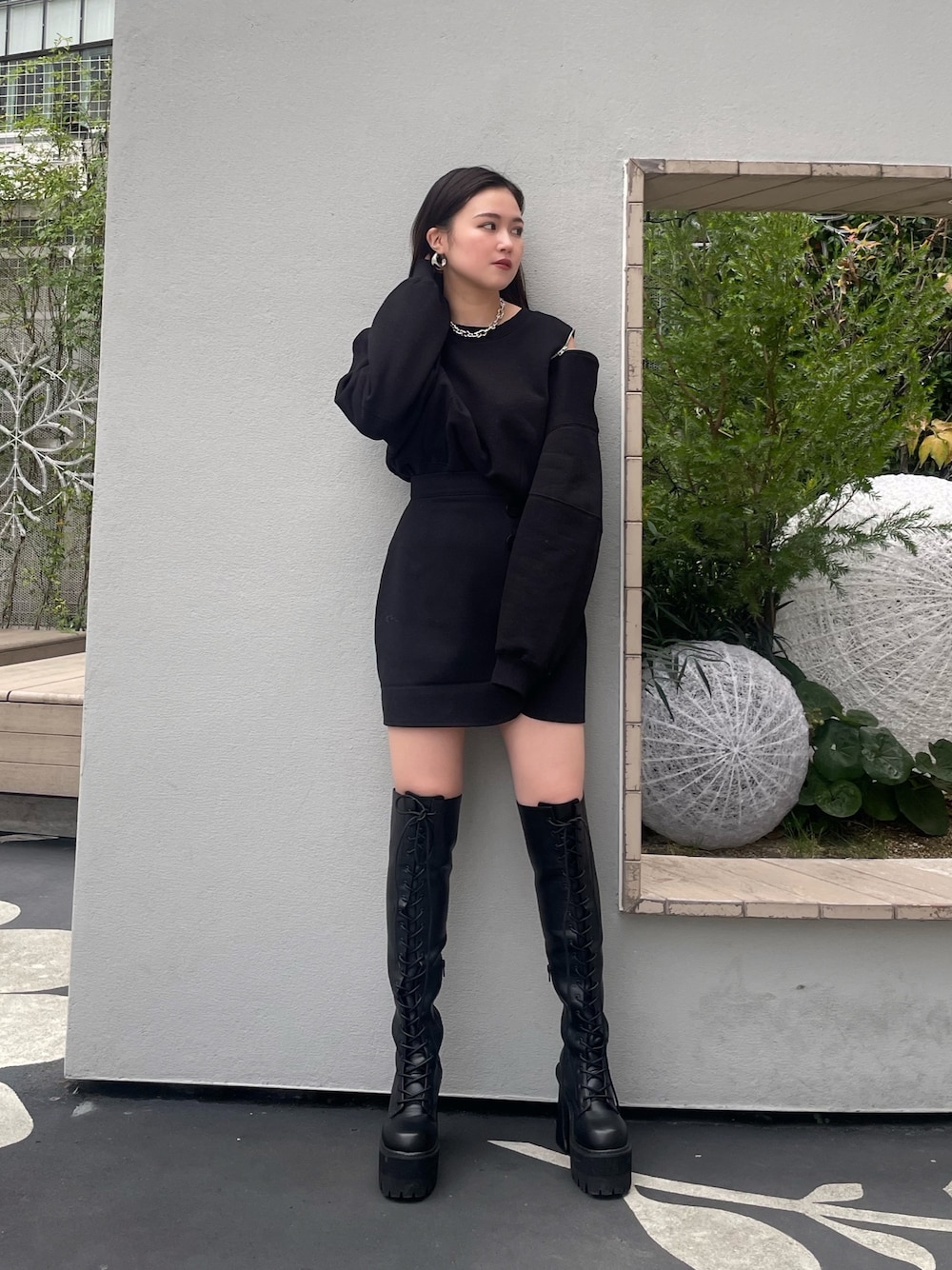 【オールブラックの肌見せコーデ】 -tops-・おへそが隠れる丈感・ジップで肌見せが調節できる・ハイネックなどを着用してジップをあけるコーデもオススメ -skirt-・インナーショーツ付き・おへそ上のハイウエスト・ボタンがある事で太もも周りがすっきり見えする -shoes-・24センチでLサイズ着用・Mでも入りますが甲高さんはLがオススメ・傾斜が緩いので長時間歩きやすい