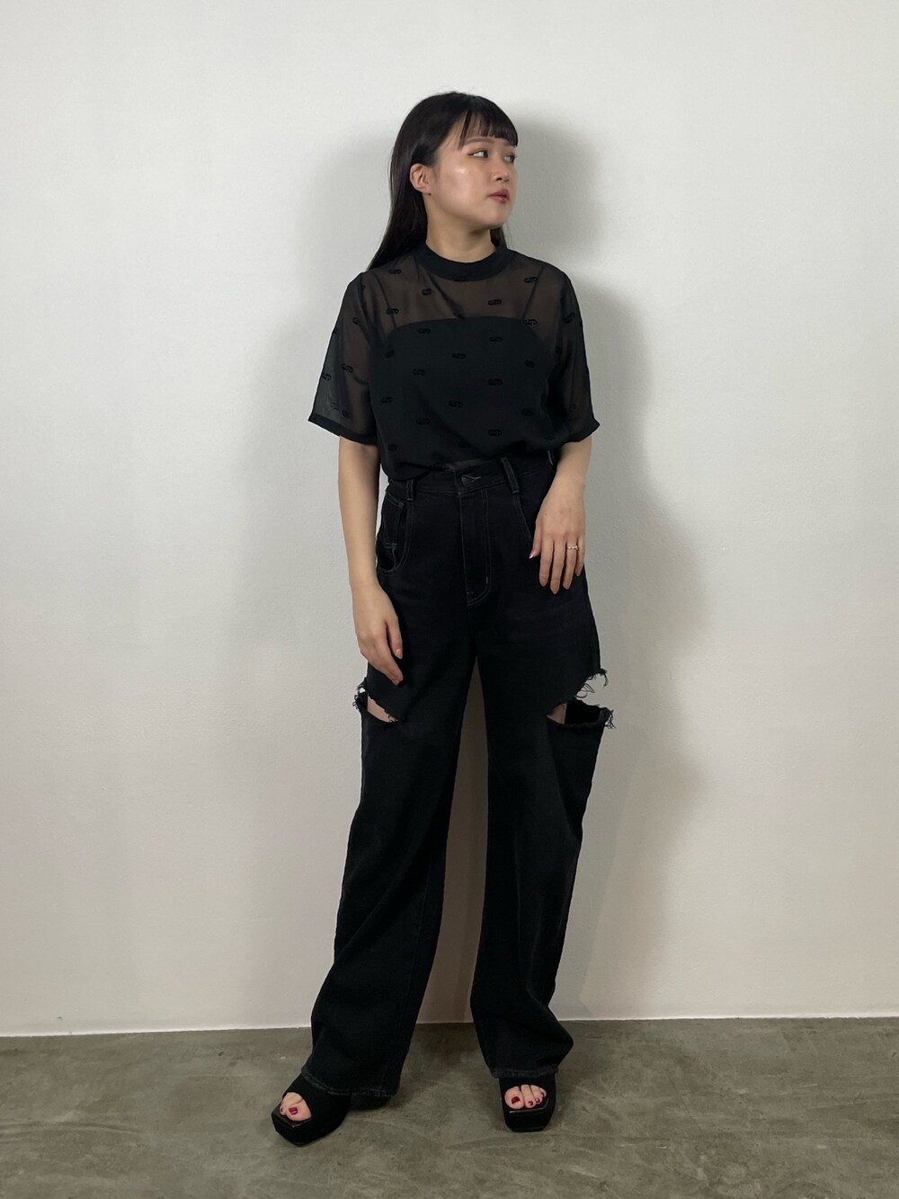 【モノトーンデニムコーデ】 -tops-・シースルーデザインでブラックでも涼しげ・首が詰まらないネックデザイン・二の腕も細見え -denim-・おへそが隠れる丈感・カットデザインで重心が上がって見えるのでスタイルアップに・生地柔らかめ