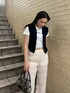【黒を入れた爽やかコーデ】 -tops-・おへそ上の丈感・コットン素材・ピタッとしすぎないシルエット -best-・クラッシュが入ってるデザイン・ジップ付きでトップスとしての着用も可能・半袖、長袖どちらでも合わせやすい -pants-・ウエストがゴム・伸縮性あり・160cmで低めの靴でちょうどいい丈感 -shoes-・24cmでMでピッタリ、Lでゆとりがある程度・靴底がクッション素材が入っているので柔らかい・長時間履きやすい