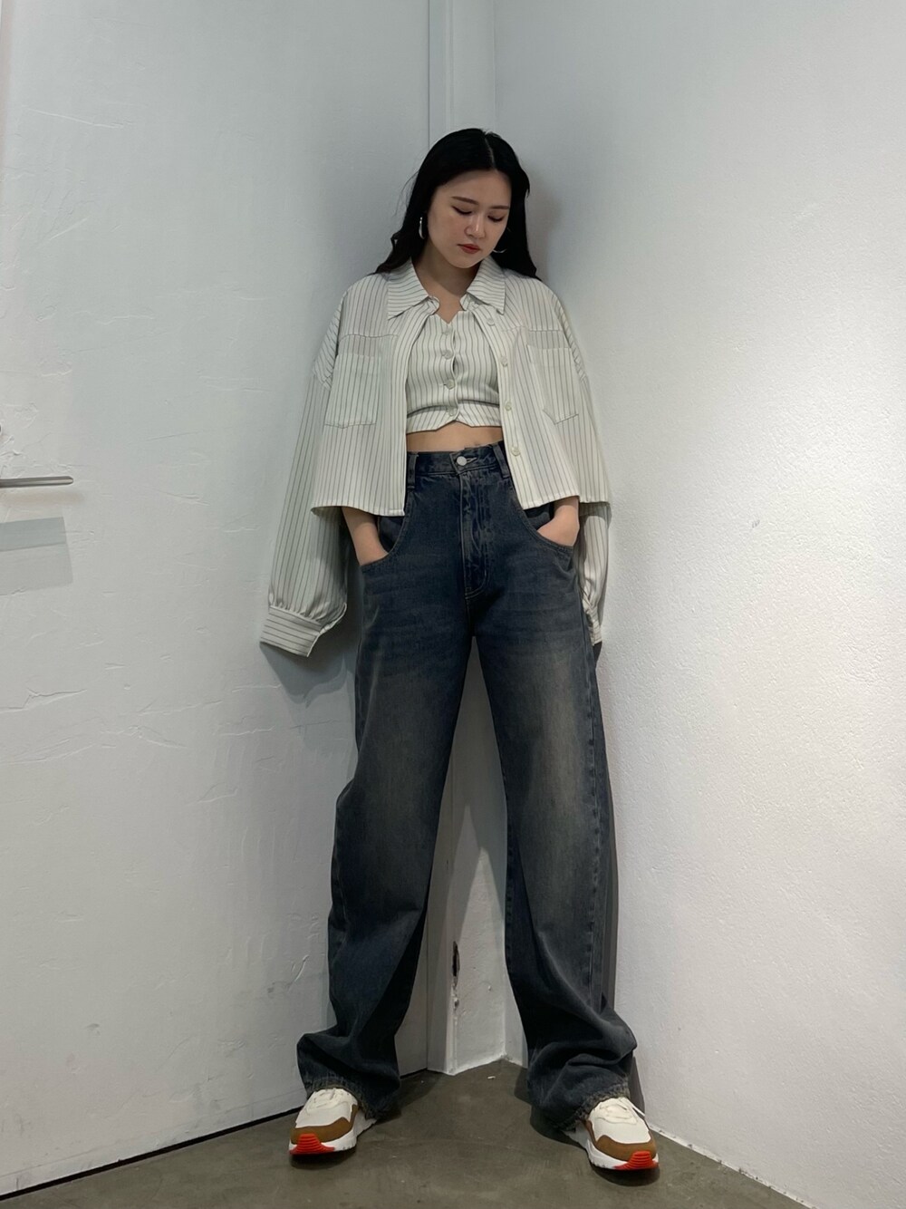 【カジュアルキレイめコーデ】 -tops-・インナー付きトップスでゴム付き・おへそ下のショート丈シャツ・シャツの胸周りはゆるっとしたデザイン -denim-・ゆるっとしたルーズデニム・おへそ上の丈感・160cmでスニーカーを履いた時に床につかないくらいの丈感 -shoes-・靴底が柔らかくなっている・柄なのでシンプルすぎない・長時間歩きやすい