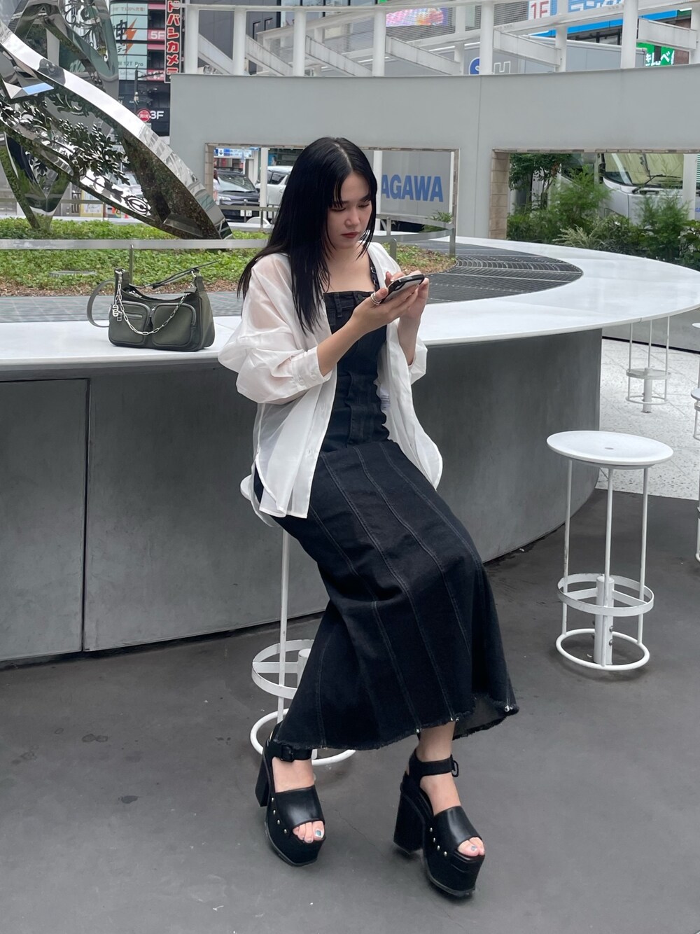 【カジュアルデニムワンピコーデ】 -one-piece-・伸縮性あり・後ろにスリットあり・アジャスターで調節可能 -shirt-・シースルーデザイン・お尻が隠れる丈感・どのシーズンでも着用しやすい -shoes-・傾斜が緩い・24cmでLでゆとりがある・合皮で馴染みやすい