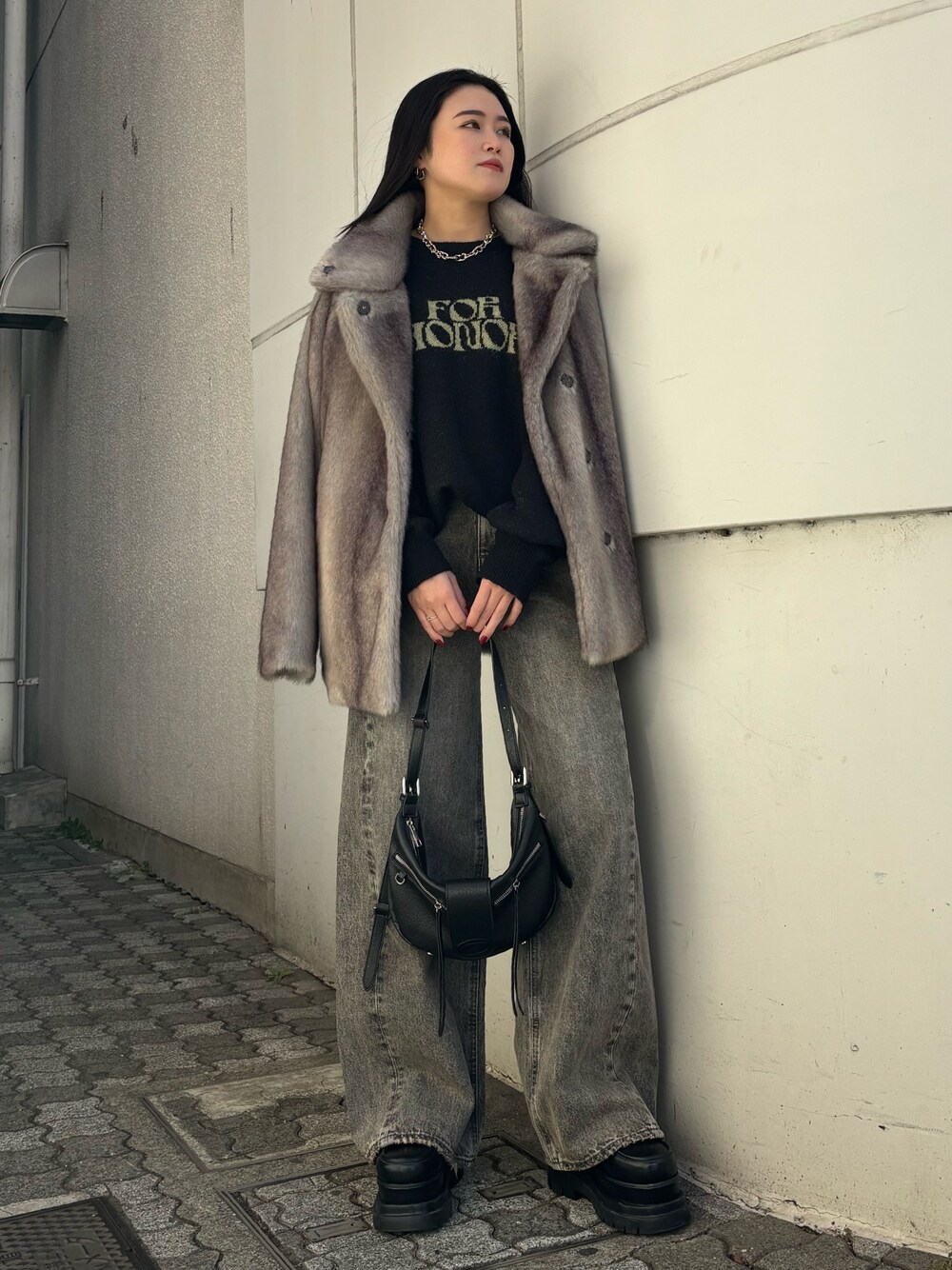 【ファーコートのデニムコーデ】 -outer-存在感があるファーコートは、ぱつっとならないのでニットでも合わせやすい。160cmでおしりが隠れる丈感です。 -tops-ロゴデザインが今どきでオシャレ見えします。おしりが隠れる丈なのでスカートなどを合わせてワンピース風にするのもオススメ。 -shoes-高さはありますが傾斜が緩く安定感があります。24cmでLサイズでぴったりでした。