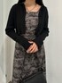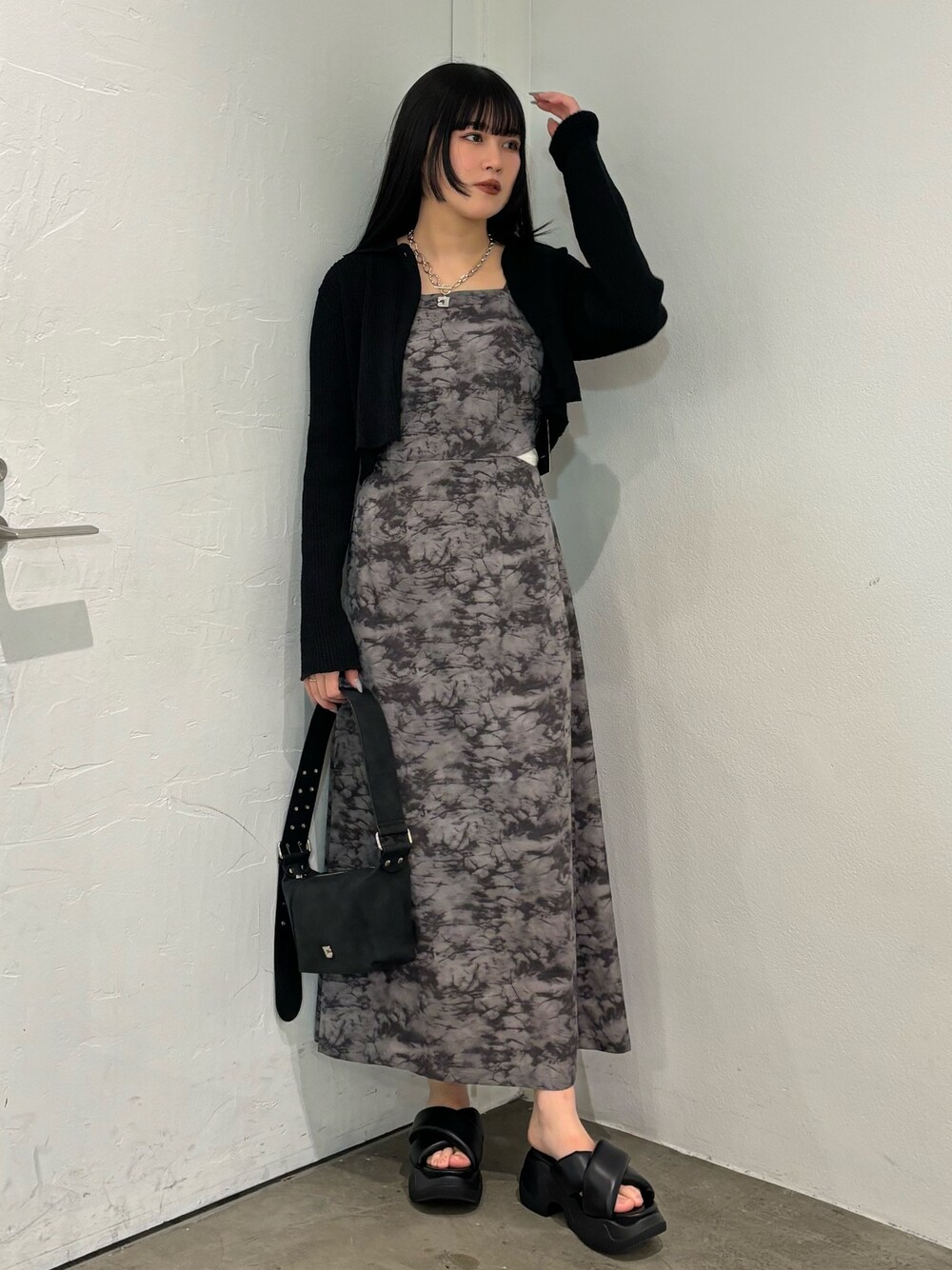 【柄を入れたモノトーンコーデ】 -cardigan-ベアトップスがセットになっているトップスをカーディガンとして着用しました。伸縮性があり着用しやすいです。 -onepiece-フレアシルエットになっているのでウエストが細見えするワンピースです。ウエスト部分がカットになっているので1枚で着用すると肌がちらっと見えるデザインになっています。