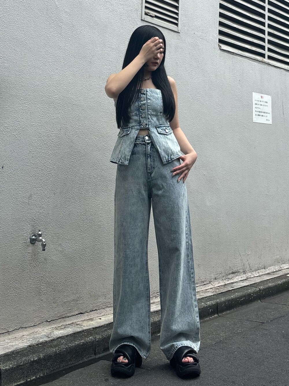 【夏のデニムセットアップ】 -tops-ウエストが細見えするビスチェtopsです。肩紐が調節できるのでおへその見え感も変えれます。インナーにティシャツなど着回しが出来ます。 -denim-おへそ上の丈感で短めのトップスと合わせて着用すると足長効果です。厚すぎず薄すぎない丈感です。 -shoes-傾斜が緩く甲デザインが柔らかいので長時間はきやすいサンダルです。24cmでもLサイズがオススメです!