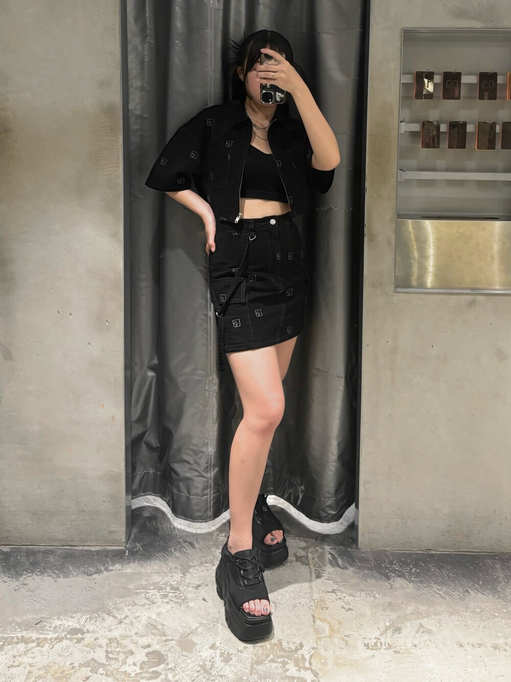 【柄デニムのセットアップコーデ】 -shirt-柔らかめのデニムで着心地抜群です。二の腕全体が隠れる丈感になっていて160cmでおへそ上になっています。 -skirt-横のポケットデザインが骨盤周りをスッキリ見せてくれるデザインです。伸縮性はあまりないですが柔らかく動きやすいです。 -shoes-傾斜が緩く長時間あるきやすいです。軽量で見た目以上に動きやすいです。