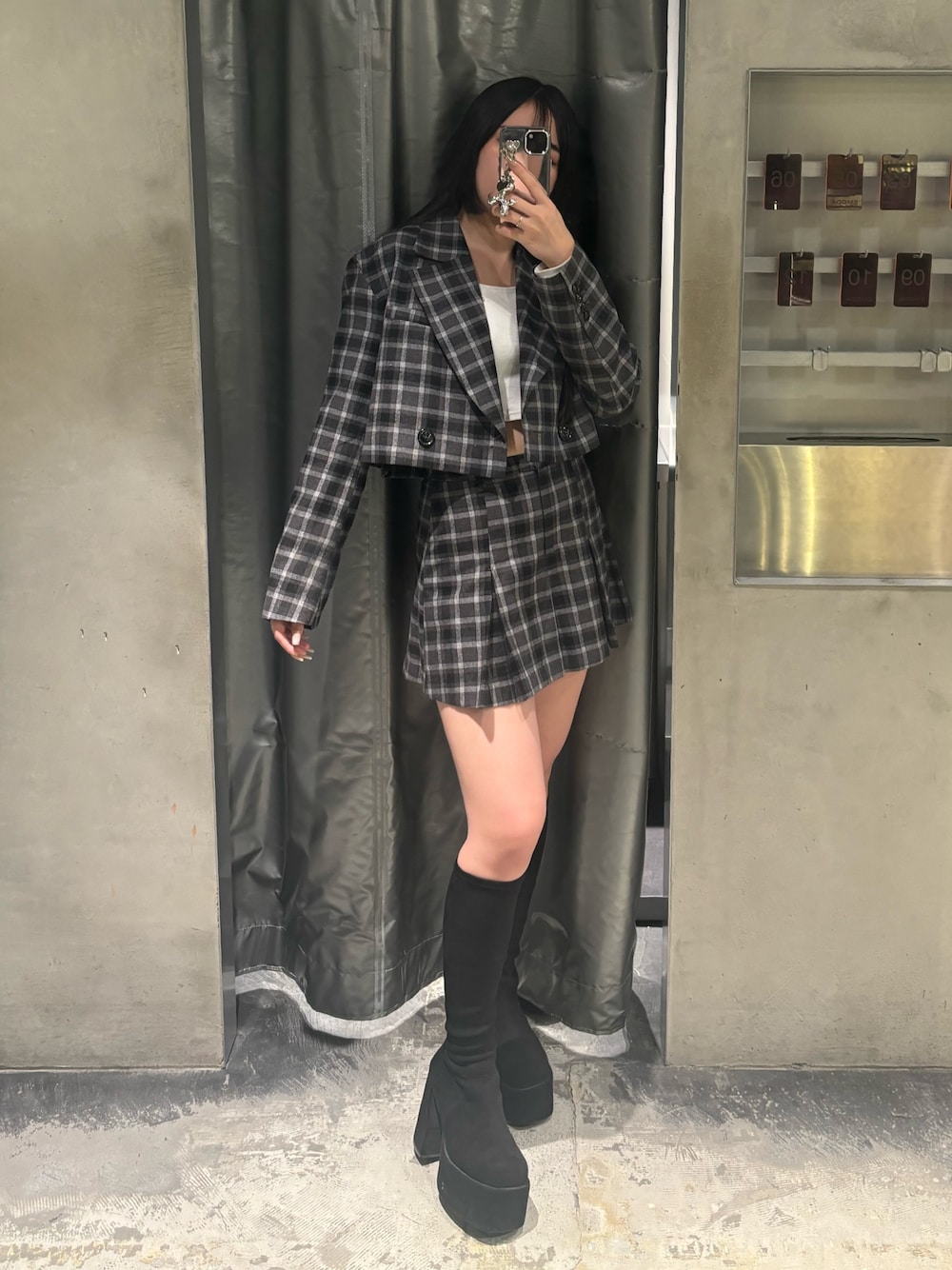 【柄のセットアップコーデ】 -jacket-おへそが隠れるショート丈です。ワンピースやデニム合わせもオススメです。 -skirt-インナーパンツが着いてるので安心して着用できます。おしりのポケット位置が高めなのでヒップアップ効果があります。 -shoes-伸縮性があり傾斜が緩いので長時間歩きやすいブーツです。24cmでLサイズの着用です。