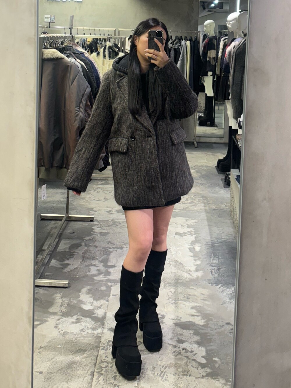 【シャギージャケットのオシャレ着コーデ】 -jacket-160cmでおしりが隠れる丈感です。ウールが60%入ってるので暖かく着用できます。トレーナーを着込める幅感でした。 -shoes-伸縮性があり傾斜が緩いので長時間歩きやすいブーツです。24cmでLサイズの着用です。