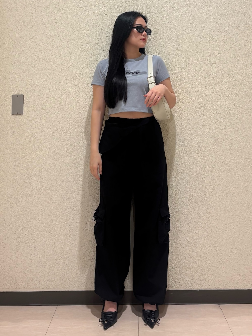 【ナイロンパンツのカジュアルコーデ】 -tops-ロゴ入りのグレー系クロップドTシャツ。シンプルですがフィット感と丈感でカジュアルっぽい抜け感を出せます。 -pants-ゆるっとしたシルエットのブラックカーゴパンツ。ウエストバッグがコーデにポイントをプラスして、こなれた雰囲気に。 -shoes-傾斜が高すぎず合皮なので馴染みやすいパンプスです。24.0でLだとキツすぎずちょうど良かったです。