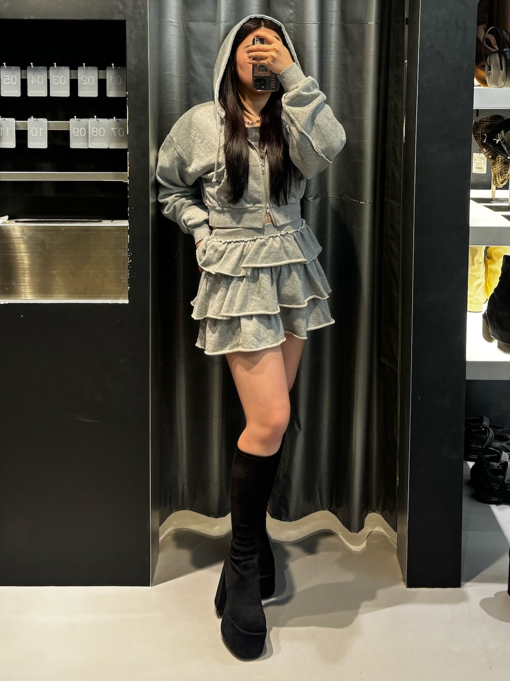 -tops-ジップが逆開ファスナーなのでボトムスによって丈感を調節できます。ファスナーを閉めておへそにかかるくらいの丈感です。 -skirt-ウエストがゴムでミニですがインナーパンツがついてるので安心して着用できます。オーバーサイズのトップス合わせもオススメです。 -shoes-傾斜が緩いので長時間歩きやすいシューズです。生地は柔らかいので着用しやすいです。