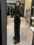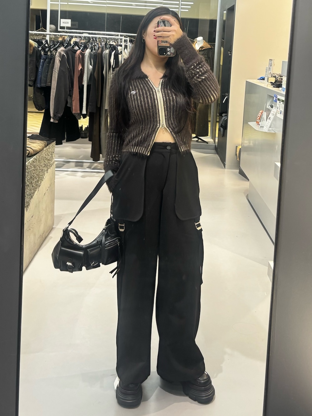 -tops-伸縮性あり。ジップを開けて羽織りとして着用してみました。襟が大きいので顔周りがすっきり見えます。 -pants-ハイウエストなので短めのトップスでも着用しやすいです。太もも周りのデザインがあるのでトップスがシンプルでも着用しやすいです。 -shoes-傾斜が緩く長時間歩きやすい。リボンのチャームが取り外しできます。