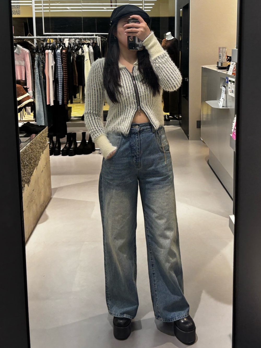 -tops-伸縮性あり。ジップを開けて羽織りとして着用してみました。襟が大きいので顔周りがすっきり見えます。 -denim-太もも周りが細見えするデザインです。トップスがシンプルでもオシャレ見えします。 -shoes-傾斜が緩く長時間歩きやすく、合皮なので馴染みやすいです。