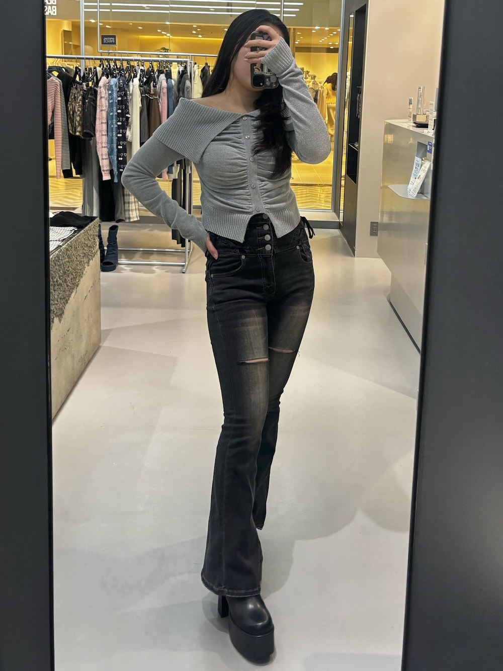 -tops-肩のアジャスターが取り外し可能です。伸縮性があり着用しやすいです。 -denim-伸縮性がかなりあり動きやすいです。トップスがシンプルでもおしゃれ見えします。腰回りが細く見えるデザインです。 -shoes-傾斜が緩く長時間歩きやすく、合皮なので馴染みやすいです。