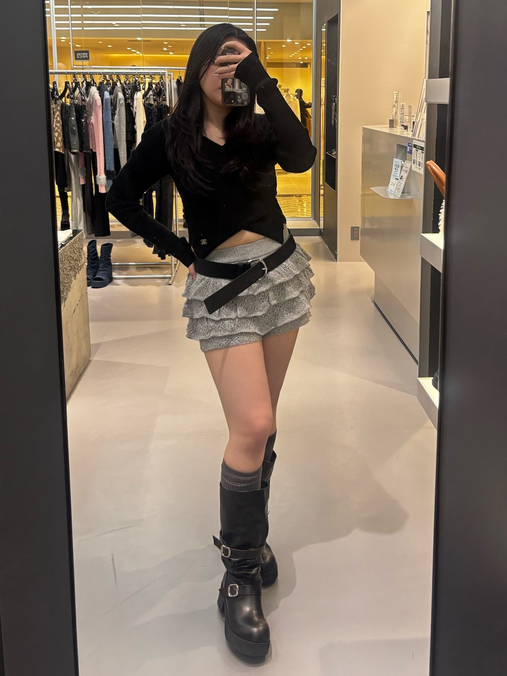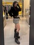 -tops-伸縮性があり首元がすっきり見えるデザインです。短すぎず長すぎないのでボトムスが合わせやすいのもポイントです。 -skirt-パンツのデザインになってるのでミニ丈ですが安心して着用できます。オーバーサイズのトップスと -shoes-傾斜が緩いので長時間歩きやすく、ふくらはぎ周りはゆとりがあるデザインです。